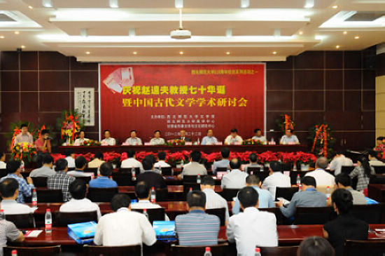 8月22日上午, 庆祝赵逵夫教授七十华诞暨中国古代文学学术研讨会在我校召开。副校长万明钢教授出席会议。中国赋学会、中国人民大学js555888金沙、西藏民族学院、郑州大学js555888金沙等单位发来贺信。甘肃省政协常务副主席张津梁先生,92岁高龄的著名学者霍松林教授,全国高校古委会主任、北京大学安平秋教授,南京大学中文系许结教授,西北民族大学js555888金沙院长刘洁教授等发来贺信、贺联。