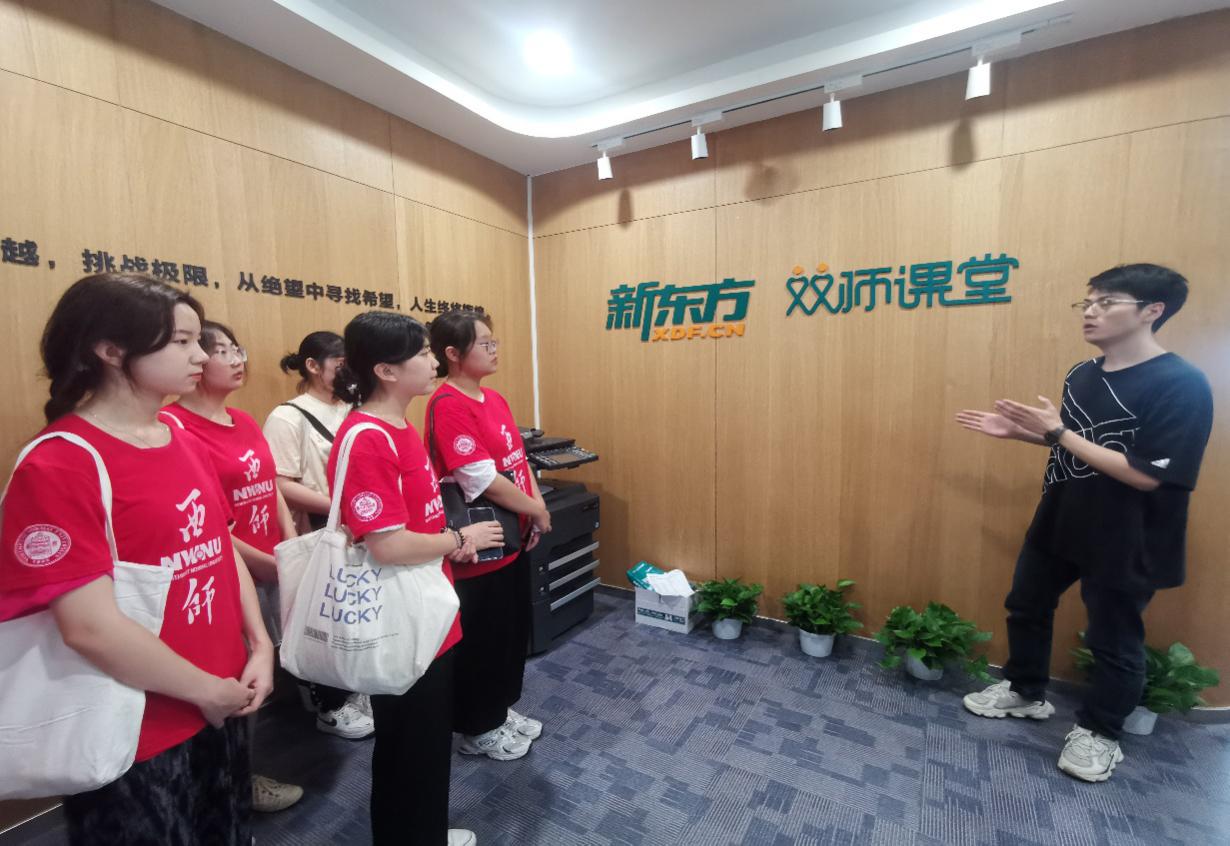 在与新东方老师深入亲切的交流后,实践队成员王芳芳说道:“了解到双师模式,强调学以致用,突出实践能力,会更加有利于学生的学习,可以让学生获得更好的更多的学习资源,而且也有利于学生职能能力提升,让学生做到锻炼品格、知识传授、实践能力‘三位一体’全面发展,这对于今后提升自己的从师技能很受启发。”