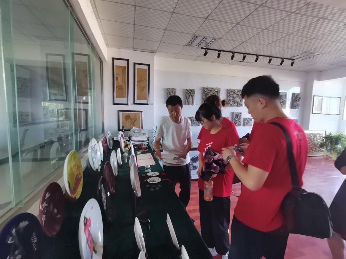 在悦心国际书画村刻瓷工作室,队员们参观了刻瓷作品。通渭刻瓷市级传承人王小宁十分热心地为实践队员讲解了刻瓷技艺的知识,让实践队员了解到刻瓷是集绘画、书法、刻镂于一身,集笔、墨、色、刀为一体的传统艺术。