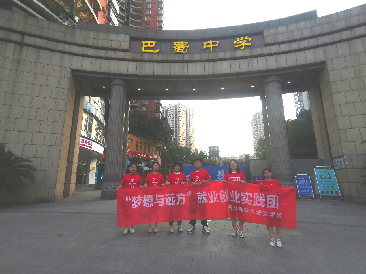 7月14日-19日,js555888金沙“梦想与远方”就业实践团前往成都、重庆两地开展社会实践活动。实践队员参观了四川大学、西南大学、西南交通大学、四川建筑职业技术学院、巴蜀中学、复旦中学等学校,通过对学校的参观、了解和学习,力求转变学生传统的就业观念,拓宽就业渠道,让毕业生少走弯路,找到属于自己的理想岗位。