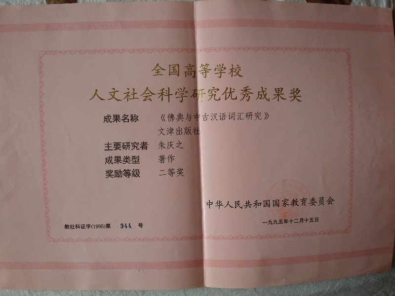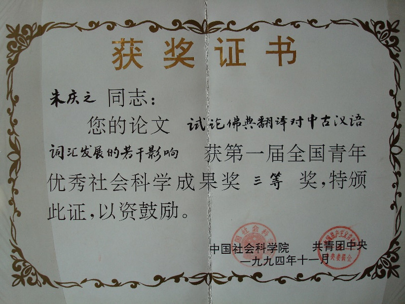 在学术方面上,朱庆之长期从事印度佛教在中国的传播对汉语和汉文化的影响研究,主张从历史语言学和接触语言学的双重角度认识古代汉文佛教文献的汉语历史研究价值,主张基于梵汉对勘的“佛教汉语”研究,是“佛教汉语研究”学科领域的开拓者、领导者和长期实践者。他的博士论文《佛典与中古汉语词汇研究》是最早以中古汉译佛典为核心语料所作的汉语断代词汇史研究专著,1995年获得由国家教委主持的首届全国人文社会科学研究成果奖的二等奖。该奖为建国以来首个全国性的文科类国家级奖项,朱庆之是该届最年轻的获奖者之一。此外,论文《试论佛典翻译对中古汉语词汇发展的若干影响》,获得由中国社会科学院和共青团中央主办的第一届全国青年优秀社会科学成果奖三等奖,也是唯一一位来自语言学界获奖者。
