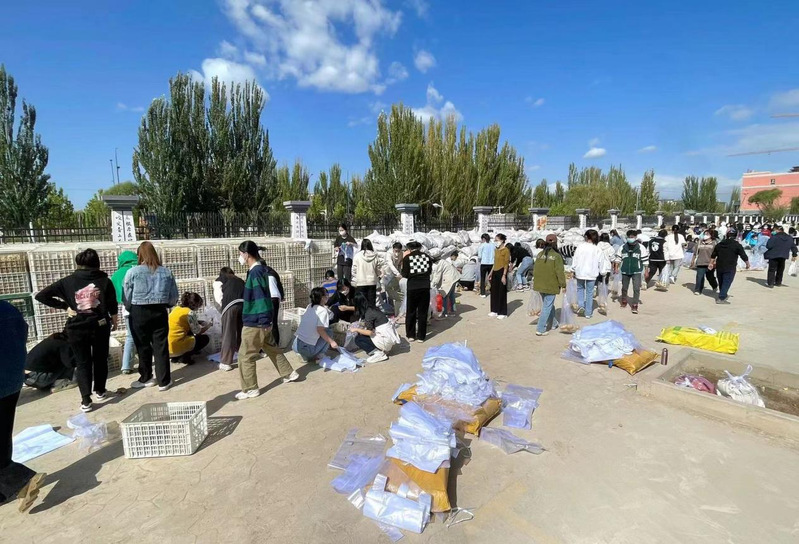受疫情影响,支教师生抵疆后便进入静默管理状态。为保证各实习学校教育教学工作的正常开展,支教学生坚持“停课不停学”,有序开展线上教学工作。同时,为接力保障阿克苏市居民基本生活需求,传播“奉献、友爱、互助、进步”的志愿服务精神,援疆师生积极承担由阿克苏市疫情防控委员会指派的抗疫爱心志愿服务活动。js555888金沙学生积极参与其中,于10月11-13日在阿克苏市第十二中学进行蔬菜装配工作,共装配土豆、西红柿等共计100吨蔬菜,分装约1万份爱心蔬菜包,获得了当地政府的高度认可。