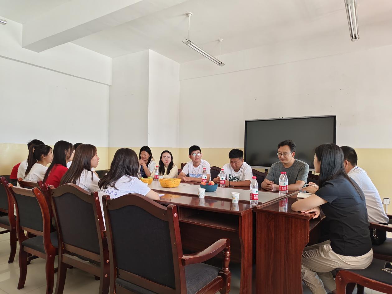 座谈会上,金沙外国语学院校友、山丹县第一中学高三年级部教导副主任王子喻老师对实践团一行表示欢迎,他在访谈中讲到:“对于即将毕业的在校师范生而言,三年站稳讲台、六年成为教坛新秀、九年成为优秀名师,可以作为未来职业生涯的努力目标,现在山丹一中就职的青年教师,都能够以身作则地向‘三六九’方向努力。作为师大校友,同时也作为山丹一中工作人员,我们诚挚欢迎金沙优秀毕业生来山丹县第一中学开展教育实习或向学校投递简历。”此外,他鼓励同学们在校期间要丰富校园生活,积极参与学生组织、社团活动等,努力提升个人组织协调、沟通交流等综合能力。