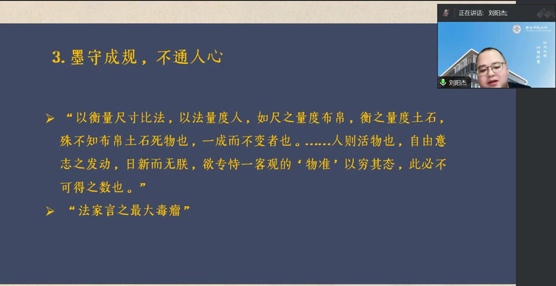 刘老师通过对梁启超《中国法理学发达史论》《先秦政治思想史》等著作的解读,将梁启超“新韩学”的法治主义内涵与政治学思想进行了细致分析。对于梁启超“新韩学”研究的意义,刘老师总结到:梁启超“新韩学”的贡献在于:“移植西方‘法治主义’观念,为韩学建构出与传统学术形态迥然有别的学理内涵与学术品格,在阐释韩非思想‘法治主义’内涵的同时,也建立起自己的‘新法治主义’思想;最早为‘新韩学’开出一个简明的‘研究指南’,划定‘新韩学’将要展开的基本方向和领域。”