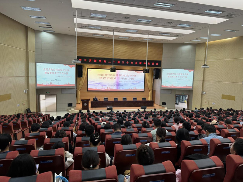 为深入学习贯彻党的二十届三中全会精神,推动全会精神在思想和行动上落地落实,进一步增强党员干部和广大师生的思想自觉和行动自觉,学院党委9月12日下午在新校区毅然报告厅召开了学习贯彻党的二十届三中全会精神宣讲暨党委理论学习中心组(扩大)学习会。甘肃省学习贯彻党的二十届三中全会精神专家学者宣讲团成员、马克思主义学院孙健教授以“全面贯彻总体国家安全观 建设更高水平平安中国”为主题开展专题宣讲,学习会由学院党委书记王晓丽主持,学院班子成员、党委委员、党支部书记及师生500余名到场聆听学习。