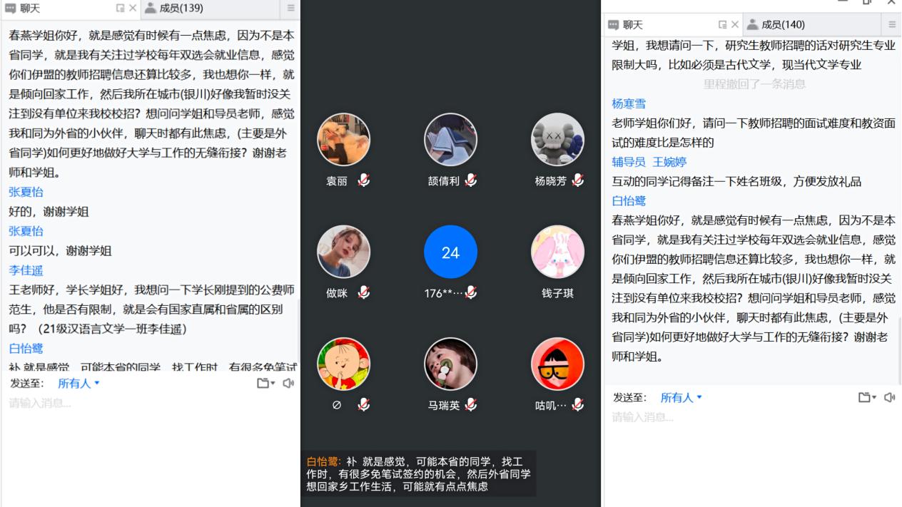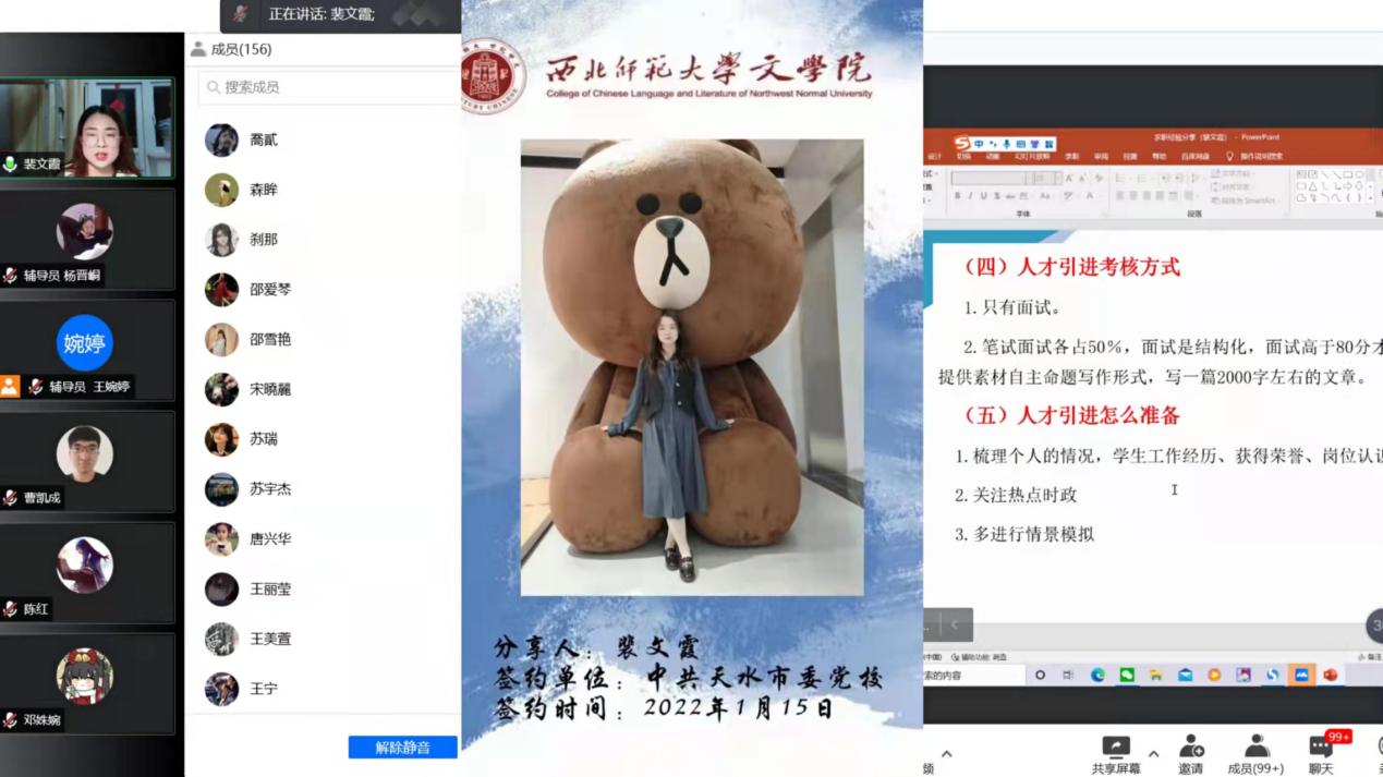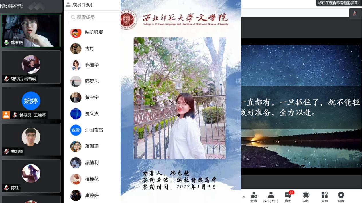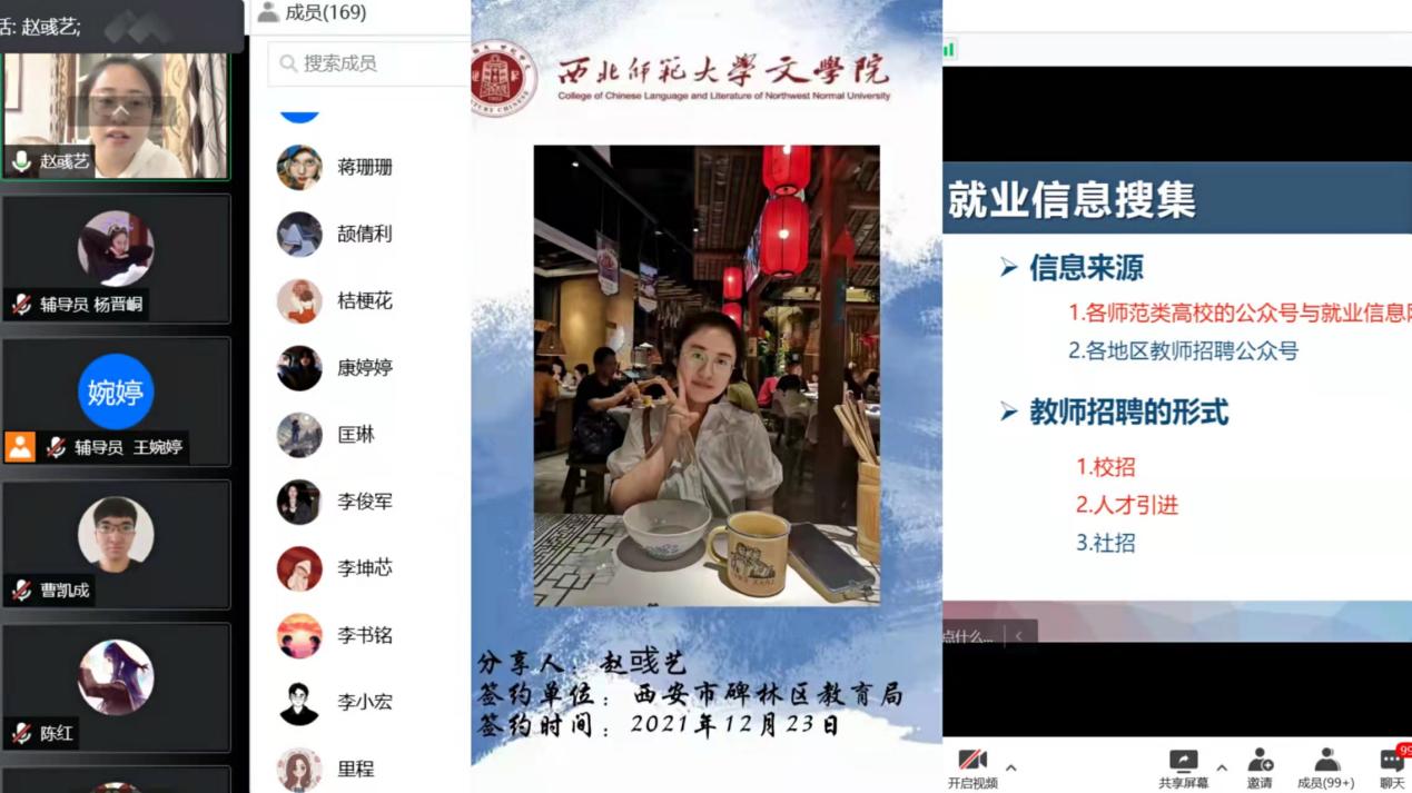 中国古代文学专业的硕士研究生赵彧艺同学早在研三第一学期就成功签约至西安市碑林区教育局,她从“认识自我与职业选择”、“信息搜集与内容整理”、“求职准备与注意事项”等三个方面为同学们详细分享了自己求职的心路历程,她希望同学们在求职过程中能够根据自己的实际情况脚踏实地地多去尝试和积累经验,积极应对、充分准备,定能求得心仪的工作。